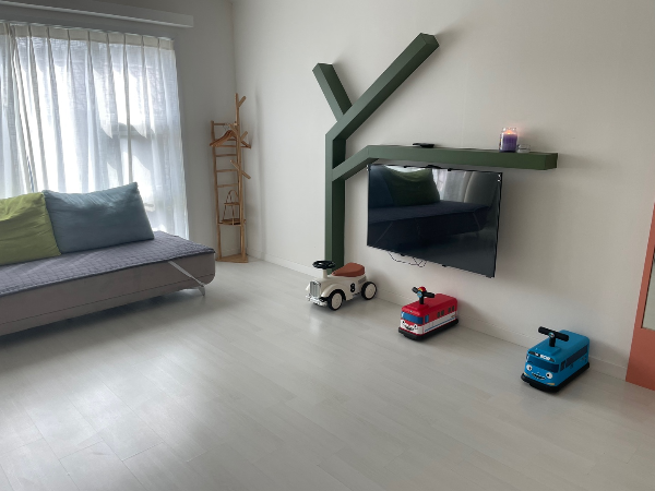 거실을 지나면 아이들이 신나게 놀 수 있는 키즈존이 나타납니다. 주방 놀이 세트, 자동차 장난감, 편백나무 놀이터 등 다양한 놀이시설이 있어 아이들이 즐거운 시간을 보낼 수 있습니다. 특히, 주방 놀이 세트와 다양한 자동차 장난감은 아이들에게 큰 인기를 끌었습니다.