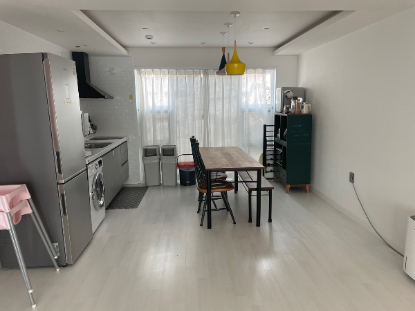 거실에는 소파, TV, 에어컨이 있고, 주방에는 식탁, 냉장고, 세탁기, 정수기, 커피 머신, 아기 의자, 젖병 소독기 등이 구비되어 있습니다. 햇살이 가득한 거실과 아늑한 분위기가 가족 여행에 딱 맞습니다.