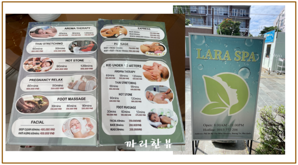 푸꾸옥 소나시 야시장에 가신다면 Lara Spaa를 꼭 이용해 보세요!!! 가족단위로 가서 받을 수 있도록 아주 크~~게 되어있어서 편안한 마사지가 될 거에요!