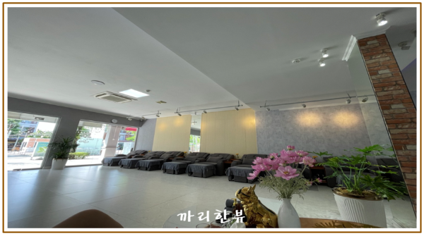 라라스파는 전체적으로 깔끔한 흰색 인테리어가 돋보이는 곳이에요. 발 마사지는 입구 쪽에서, 전신 마사지는 커튼으로 나뉜 프라이빗 공간에서 받을 수 있어요.