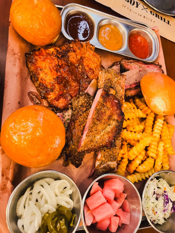 대표 메뉴인 잭 플래터와 존 플래터는 브리스킷, 자이언트 비프립, 풀드포크, 그리고 스모크 칠리 치킨으로 구성되어 있는데, 12시간 이상 훈연해 고기가 입안에서 살살 녹는 그 맛은 말로 다 할 수 없을 정도예요.