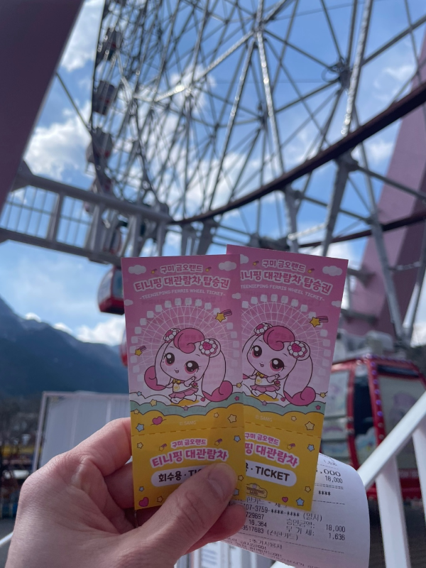구미 금오랜드의 명물인 대관람차도 티니핑으로 꾸며져 있어 포토존으로 제격이에요. 이용요금은 9,000원으로 다소 높은 편이지만, 사진으로 추억 남기기엔 아주 좋아요.