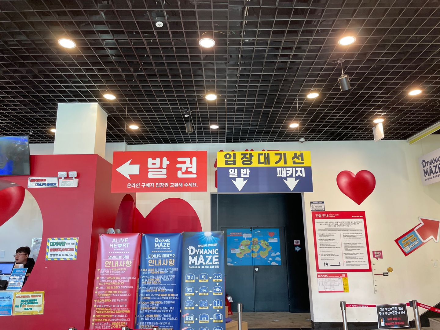 속초 다이나믹메이즈는 강원특별자치도 속초시 원암학사평길 88에 위치해 있어요. 1층 매표소에서 네이버 예매 확인 후 종이티켓으로 교환하면 입장 준비 끝! 입구에는 일반 대기선과 패키지 대기선이 따로 있어 혼잡하지 않게 운영되고 있었어요.
