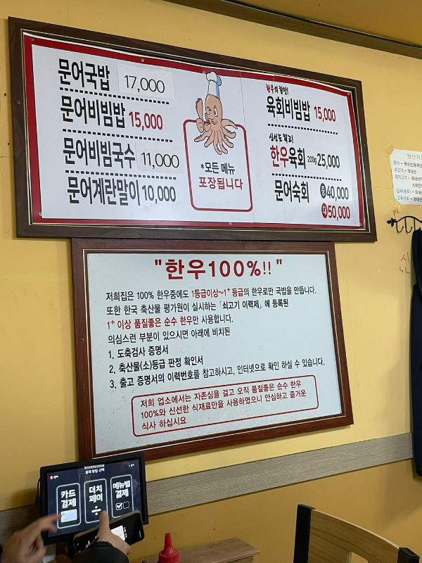 ‘속초문어국밥’의 핵심은 바로 100% 1등급 이상 한우 육수입니다. 메뉴판 아래 적혀 있는 문구를 보면 자신감이 느껴져요. “저희집은 1등급 이상 한우만 사용합니다.” 그만큼 고기와 육수의 품질에 대한 자부심이 대단하더라구요.