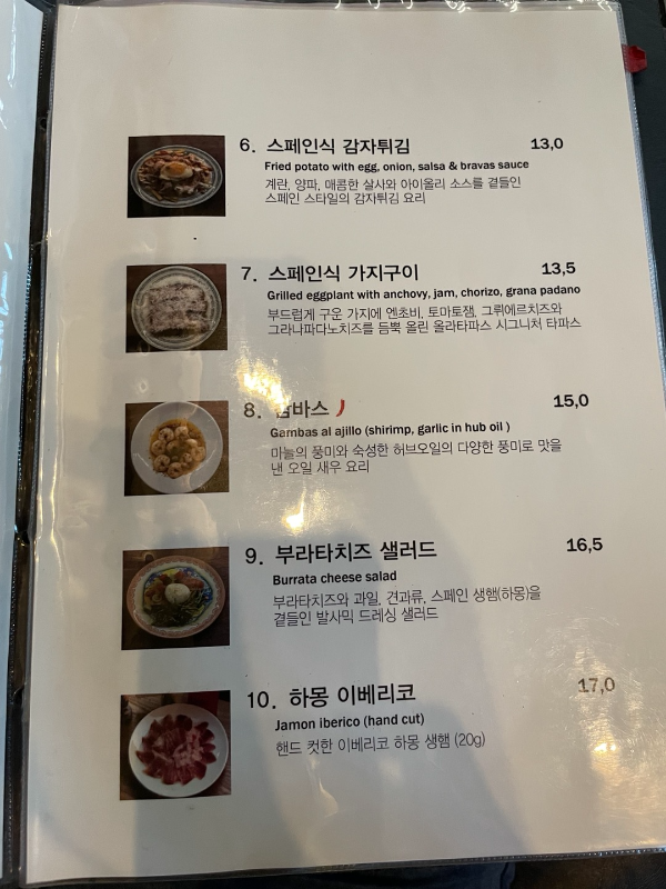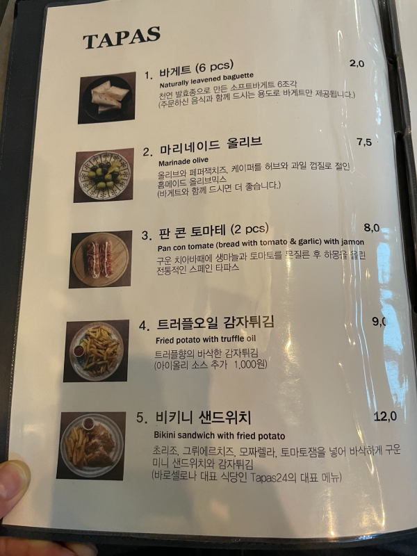 사진 속 메뉴판처럼 안양 올라타파스는 이름 그대로 ‘타파스’가 메인인 스페인 레스토랑이에요. 앞쪽 TAPAS 섹션에는 바게트, 마리네이드 올리브, 판콘 토마테 같은 기본 타파스부터 트러플오일 감자튀김, 스페인식 감자튀김, 감바스, 부라타 치즈 샐러드, 하몽 이베리코까지 다양하게 구성돼 있어요.