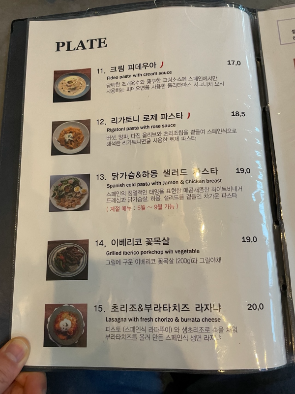 메인 PLATE 라인에선 우리가 실제로 주문한 크림 피데우아(11번), 리가토니 로제 파스타(12번), 이베리코 꽃목살(14번)이 눈에 띄어요. 그 외에도 닭가슴살&하몽 샐러드 파스타, 초리조&부라타 치즈 라자냐 등 스페인 스타일로 재해석한 메뉴들이 쭉 이어지죠.