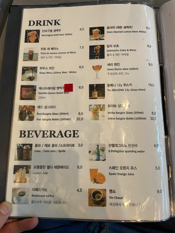 - 스페인 오렌지 주스, 레몬에이드, 아메리카노 등 논알콜 음료도 다양