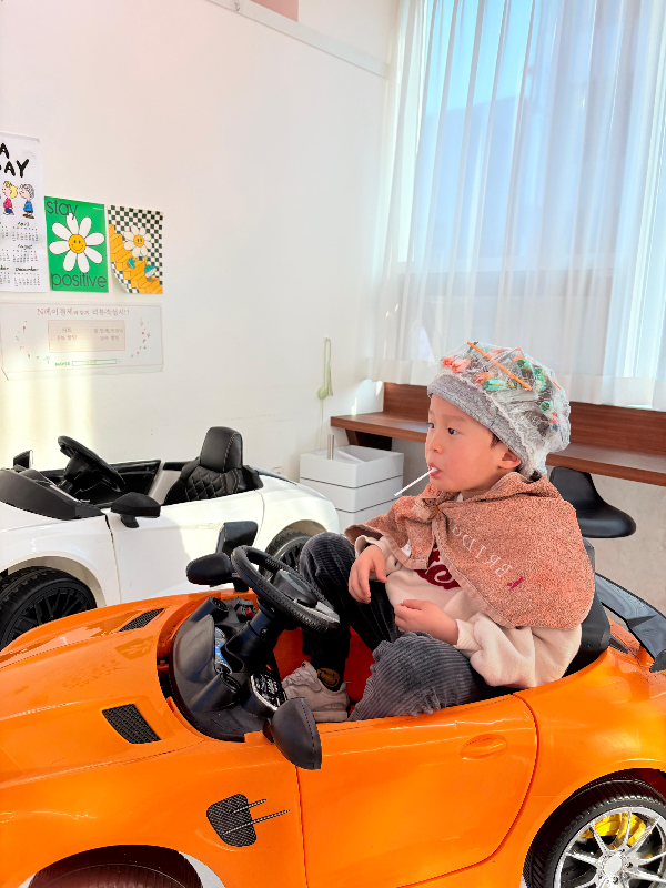 아이 키워보신 분이라면 아실 거예요. 미용실 한 번 가면 대부분은 울고, 불안해하고, 중간에 도망가려고 하고… 그런데 큐디씨에서는 단 한 번도 울지 않았습니다. 자동차 타고, 사탕 먹고, 영상 보고, 물어도 주시고… 바쁠 틈이 없어요.