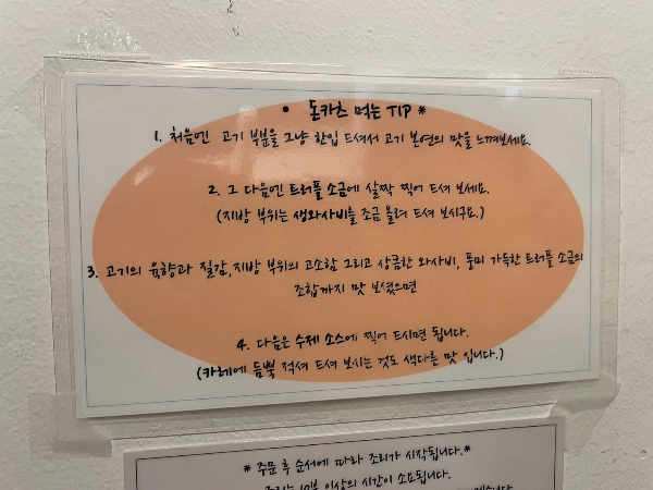 실제로 매장 벽면에 안내가 이렇게 붙어 있어요. 첫 조각은 아무것도 찍지 말고 다음엔 트러플 소금 이후 와사비 한 점 마지막은 소스 이 동선대로 먹으면 맛이 점층적으로 변합니다. 정말 파주 금릉역 돈까스 맛집이라고 말할 수밖에 없는 이유!