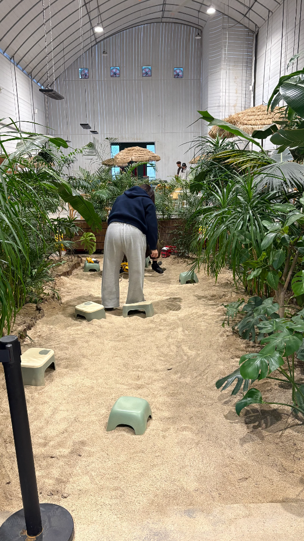 모래 위에서 굴착기랑 덤프트럭 조종하는 공간이에요.
