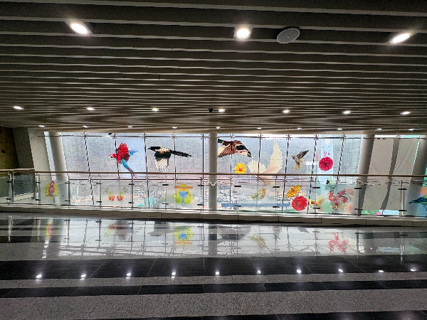 전시관을 한 바퀴 돌고 나오면 통유리 복도가 나오는데, 새와 꽃 일러스트가 가득해서 아이랑 천천히 걸어가며 사진 찍기 딱 좋습니다. 밖 풍경까지 어우러져서 진짜 힐링 루트.