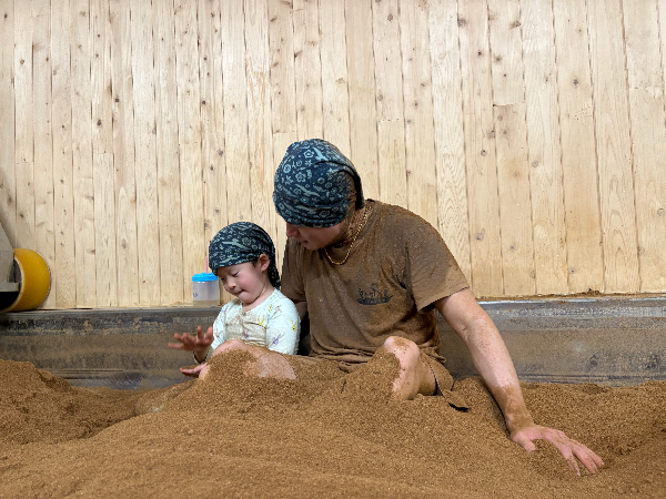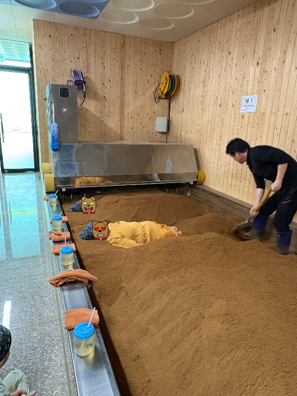 인원에 맞춰 자리를 만들어 주신 뒤 누우면, 직원분이 직접 삽으로 쌀겨를 덮어주세요.