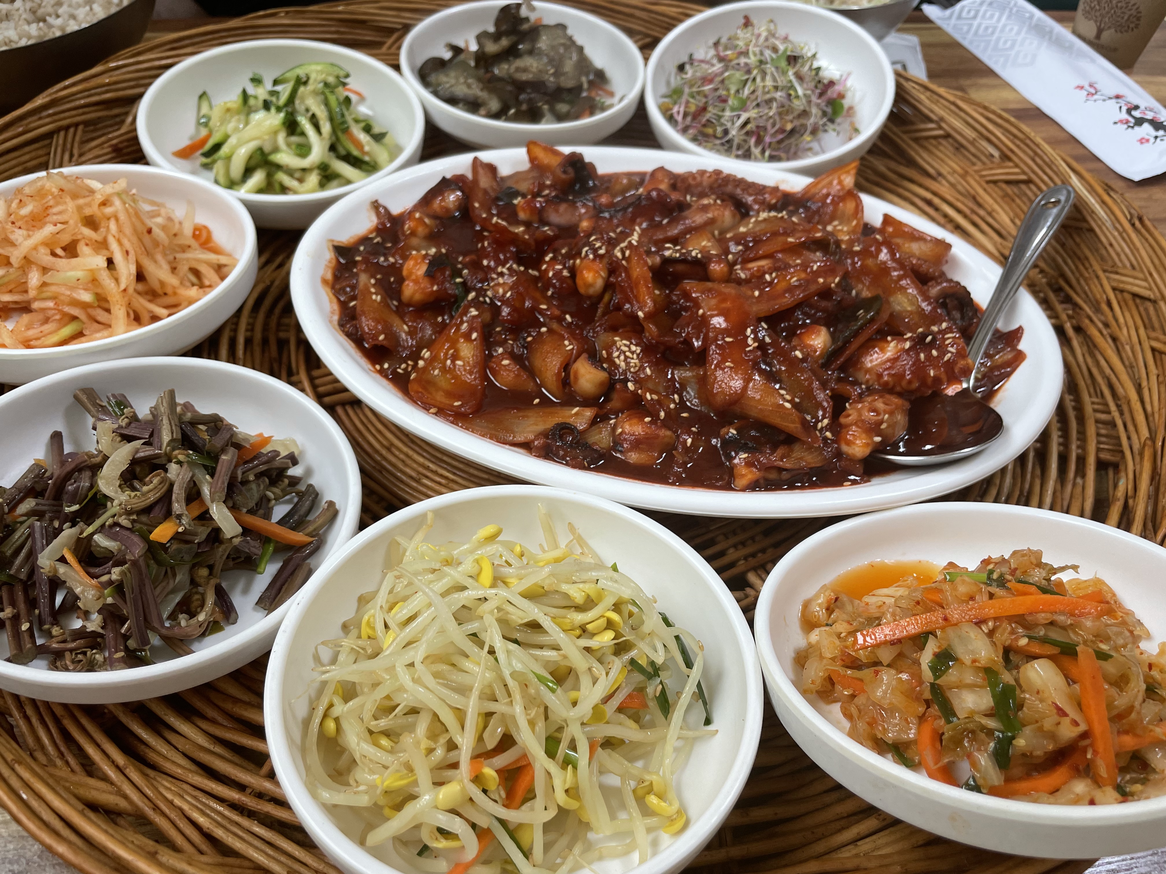 낙지볶음 보리밥 한상차림입니다.