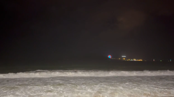 화려한 호텔 조명과 현지 사람들의 일상이 공존하는 느낌.
