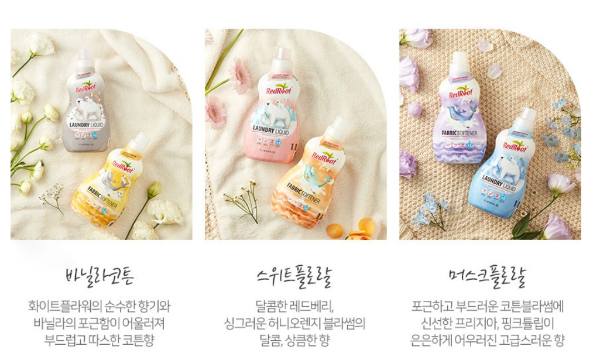 향기는 3가지로 바닐라코튼 / 스위트플로랄 / 머스크플로랄 이렇게 있는데 머스크플로랄도 한번 사용해 보았는데 개인차이겠지만 저는 바닐라코튼향이 더 좋은듯 하더라구요!